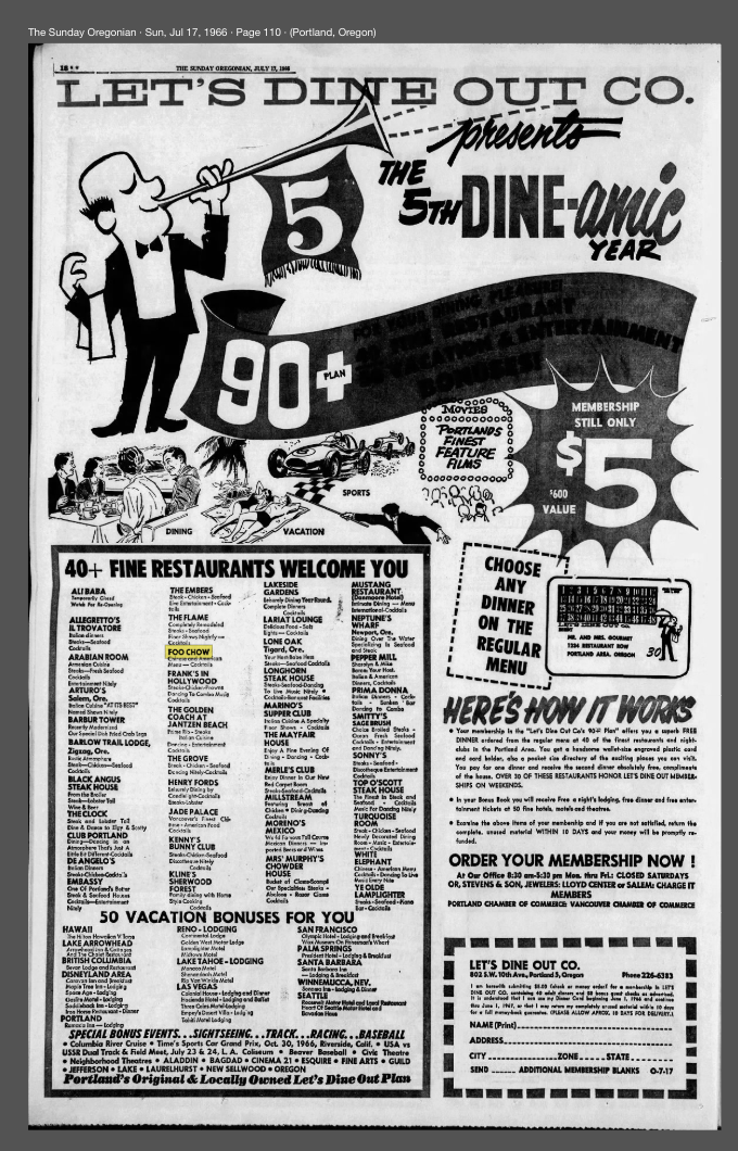 In 1966, the restaurant tried to increase foot traffic by participating in Portland’s annual restuarant “Let’s Eat Out” program where a diner could purchase. coupon book giving then access to 40 restaurants that would provide free meals in exchange for their specific coupon.
