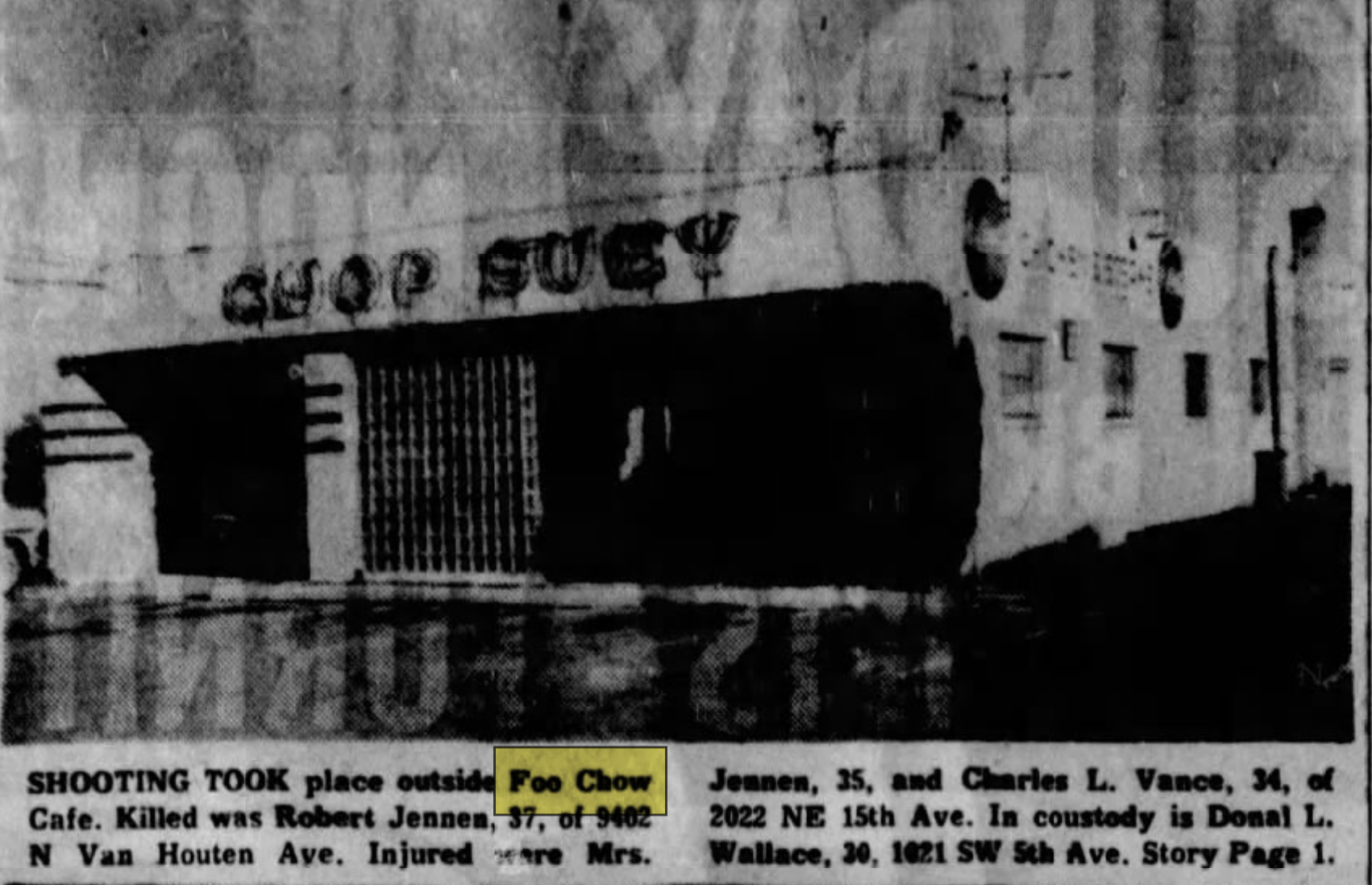 Like many of Portland’s Chinese restaurants, Foo Chow kept late hours. On November 6, 1960, local papers announced that Foo Chow had been the site of a shooting and murder. Donald A. Wallace argued with Robert Jenson and Charles L. Vance over a jacket that was thrown over a booth in the restaurant at 3am, and noted that the aggrieved parties escalated their argument outside, with Wallace killing Jenson and wounding Vance in front of their respective wives. In a weird twist, newspapers discovered that several years before, Wallace had been lauded as a hero for jumping in front of a moving train to rescue a child who had fallen on the tracks. The murder trial, eventually a death penalty case, drew plenty of unwanted attention to the restaurant in local papers.