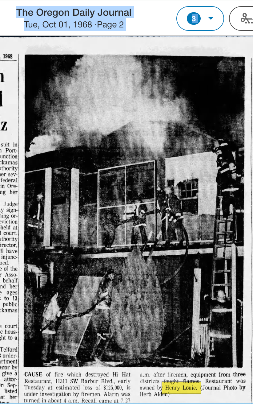 The Hi Hat restaurant was built and owned by Henry Louie, and then his son Stephen and daughter Janet, after him. The restaurant was first located on SW Barbur Blvd from around 1958 to 1968, when its first location burned, at an estimated loss of $125,000. A larger restaurant was built, featuring a bar that accommodated live entertainment and a venue that could seat 300 persons, on the outskirts of Portland, in Tigurd. This second location, on the Pacific Coast Highway, opened in 1970 and remained open until 2011.