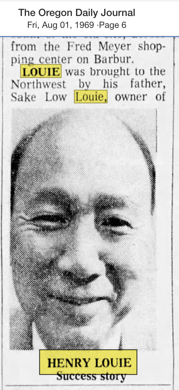 Henry Louie was one of the foremost restaurateurs in the Chinese American business community, showing up as regularly in newspaper accounts as Leland Chinn. Henry Louie had reportedly come to Portland in 1983, working at the famous Portland restaurant, Huber’s. A 1970 Oregonian profile (January 30th), described Louie as having followed the tradition of the men of his family, working in the US but marrying and starting a family back in China. His son, Steve, was brought to the US with his mother as a teenager, having been separated from his father for 14 years. Steve served in the US airforce during World War II and assisted in running family restaurants. His son, Steve, Jr., was noted to be the first American-born Louie male in the family. The 1970 profile noted the many leadership roles that Henry Louie played in the local Chinese American community–President of the “Ban Gan” tong and Vice President of the “Suey Yen Tong” as well as a member of the Chinese Restaurant and Business Association.