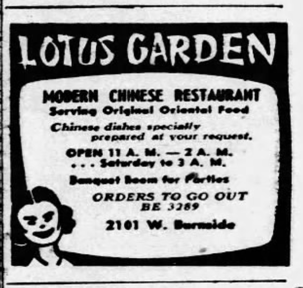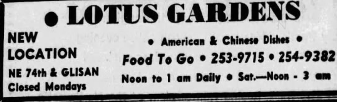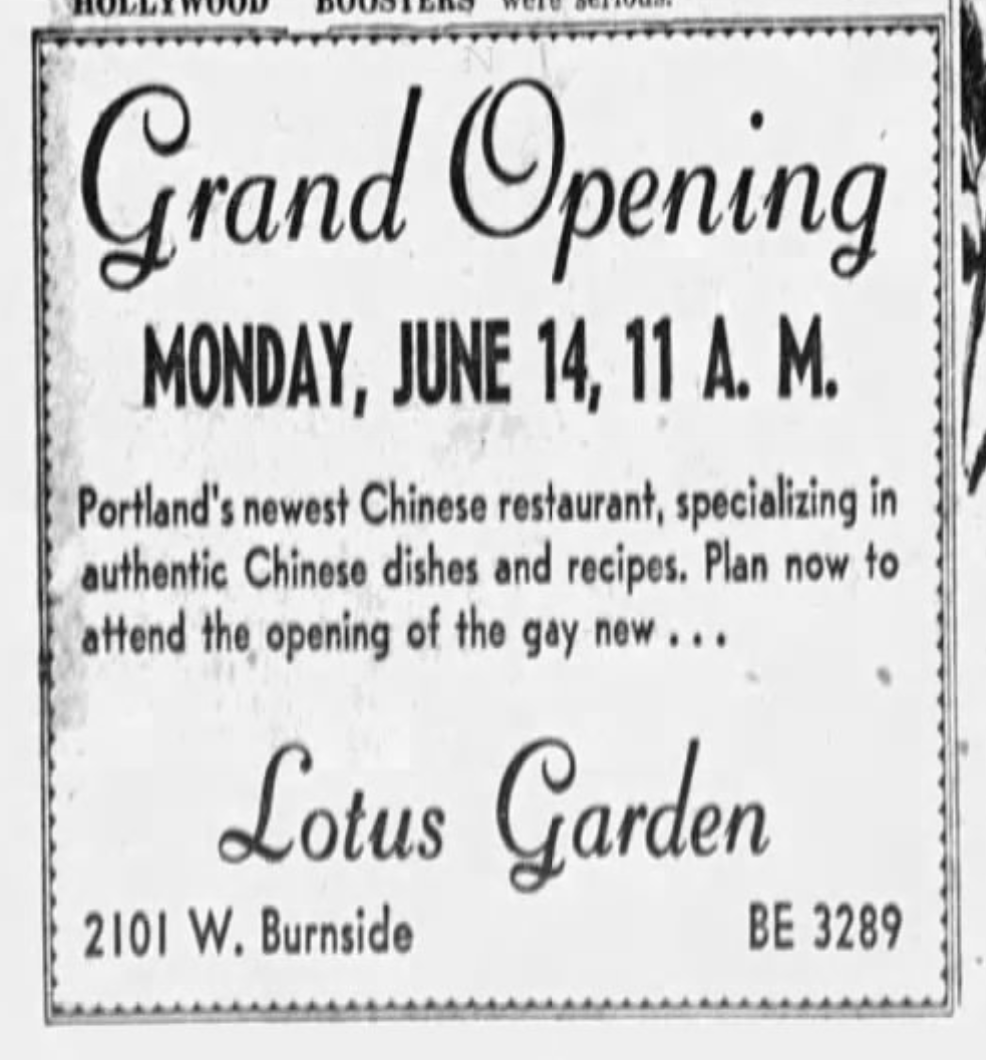 Lotus Garden first appears in the newspapers in May of 1954, when a classified advertisement announced the sale of kitchen equipment at the Lotus Garden restaurant. As the restaurant does not appear in the city directories before 1955, this probably represents Allen Louie’s takeover of an existing restaurant and renovation of the kitchen. Lotus Garden announced its grand opening June 13, 1954 in the Oregon Daily Journal, and advertised their restaurant and banquet room there regularly for the rest of 1954.