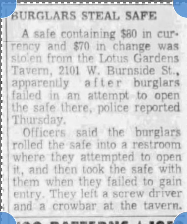 May 8, 1959 Article from The Oregonian describing the poorly executed theft of a safe from the Lotus Garden.